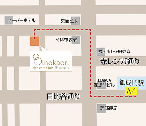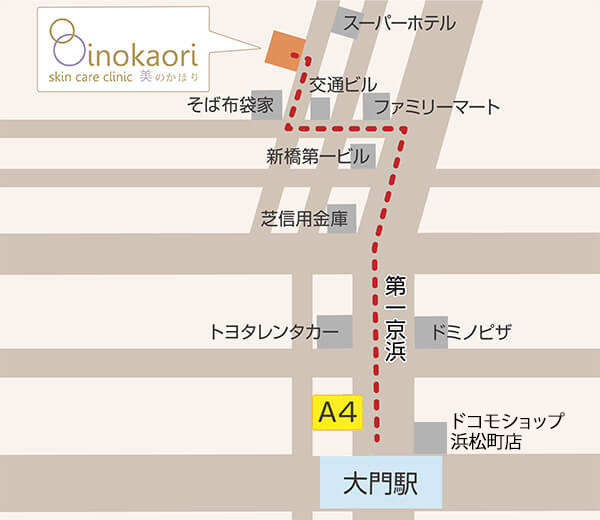 ④真っ直ぐ歩いて行くと左手にスーパーホテルの看板が見えます。スーパーホテルを少し越えて右側が、 skin care clinic 美のかほりです。