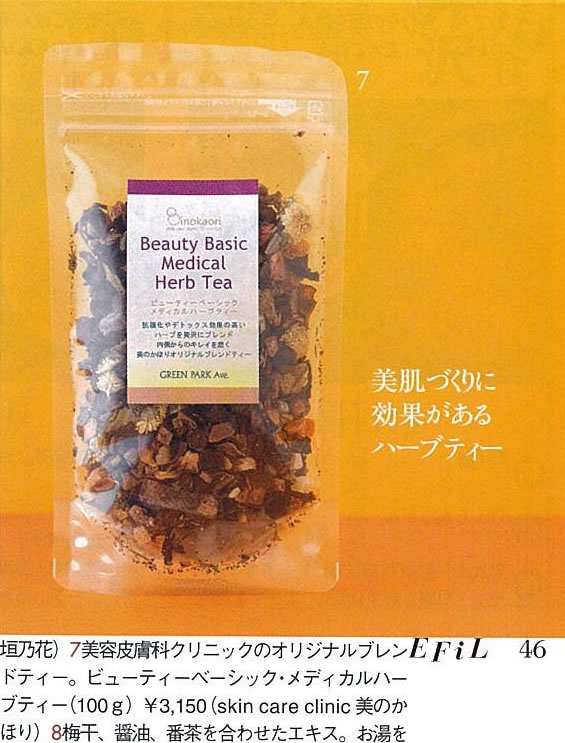 「美肌づくりに効果があるハーブティー」として、ビューティープロデューサーの吉岡妙子がプロデュースした当院オリジナルメディカルハーブティー「BEAUTY BASIC」をご紹介いただきました。