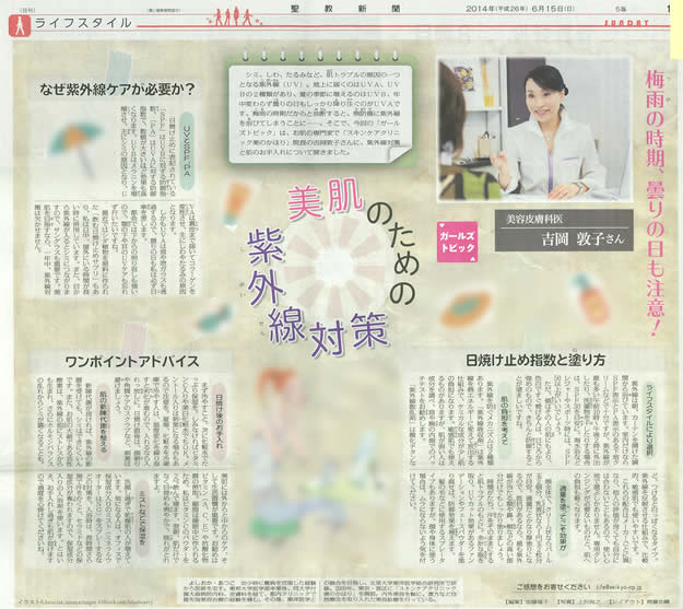 吉岡敦子院長が、「美肌のための紫外線対策」特集で、日焼けのお手入れなどについてお話させていただきました。